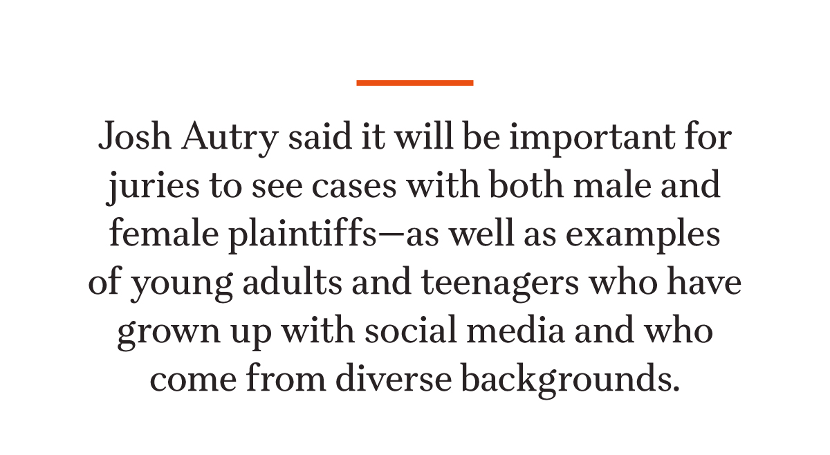 Отри изтъкна, че при тези прецедентни дела – чрез които няколко пробни случая очертават модел за разглеждането и решаването на хиляди подобни – е важно съдебното жури да се запознае с дела и на мъже, и на жени ищци, както и с истории на млади хора с различен произход, израснали в епохата на социалните медии.