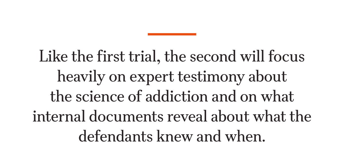 Подобно на първия процес, вторият ще се съсредоточи основно върху експертни показания за науката за зависимостта – включително изследвания за въздействието на проблемната употреба върху развиващия се мозък на подрастващите – и върху вътрешни документи, разкриващи какво са знаели ответниците и кога.