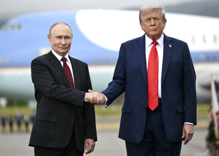 Американският президент Доналд Тръмп поздрави руския президент Владимир Путин на летищната писта, след като двамата пристигнаха в съвместната военна база "Елмендорф-Ричардсън" в Анкоридж, щата Аляска, на 15 август 2025 г. Андрю Кабалеро-Рейнолдс/AFP чрез Getty Images
